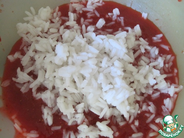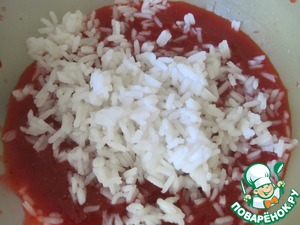 В одну часть сливок добавляем 1 часть клубничного пюре с рисом, добавляем 1/3 часть растворенного замоченного желатина. -