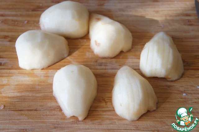 Груши очистить от кожицы, разрезать пополам, удалить семенную коробку. Сделать на половинках продольные надрезы с выпуклой стороны.