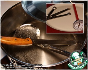 Одним из главных условий удачи в процессе является чистота. Поэтому, все, что будем использовать, лучше всего подвергнуть практически стерилизации. Инвентарь кипятим в той кастрюле, в которой будем сыр варить.
