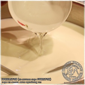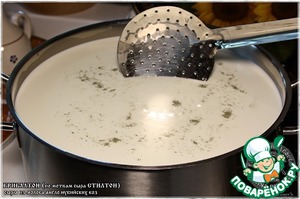 • Затем, используя дуршлаг, сито и небольшой черпак (обязательно не забывайте обрабатывать кипятком весь инвентарь перед использованием) уберите из кастрюли сыворотку.
