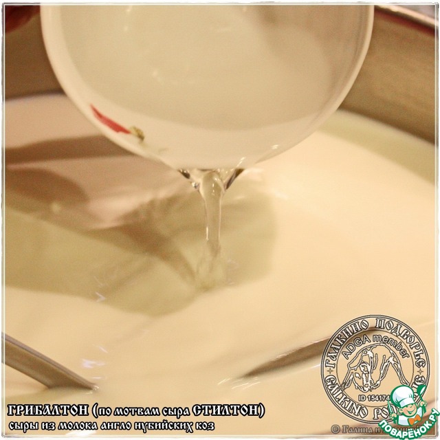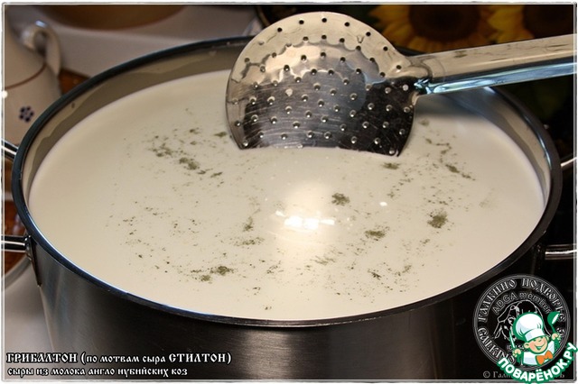 • Добавляем в молоко отмеренную мезофильную закваску и пенициллиновую культуры Penicillium roqueforti, которая обеспечит голубые жилки внутри головки сыра, также как и его изысканный вкус.
