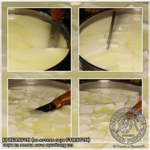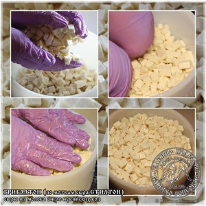 • Сгусток надо нарезать на кубики размером примерно два с половиной на два с половиной сантиметра.