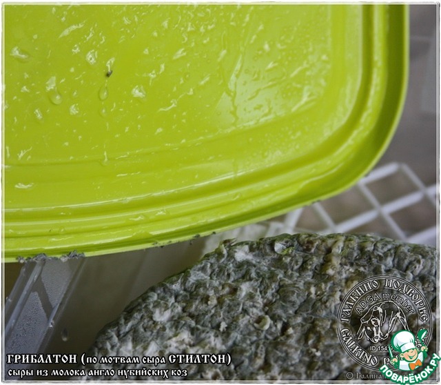 • А дальше перекладываем головку в контейнер. Сыр выдерживается первые трое суток при комнатной температуре. Обязательно два раза в день переворачивать и не забывать убирать излишнюю влагу. Контейнер протирать, полотенца бумажные в подстилке менять.