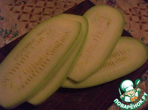 Кабачки порезать пластинами толщиной 0,5-0,7 мм. Количество пластин должно быть четное.