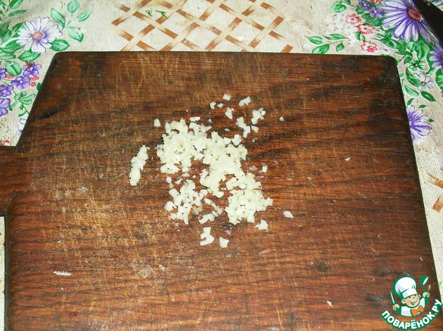 Чеснок мелко порубить, можно пропустить через пресс. Но нам вкуснее было, чтоб чесночок чувствовался.