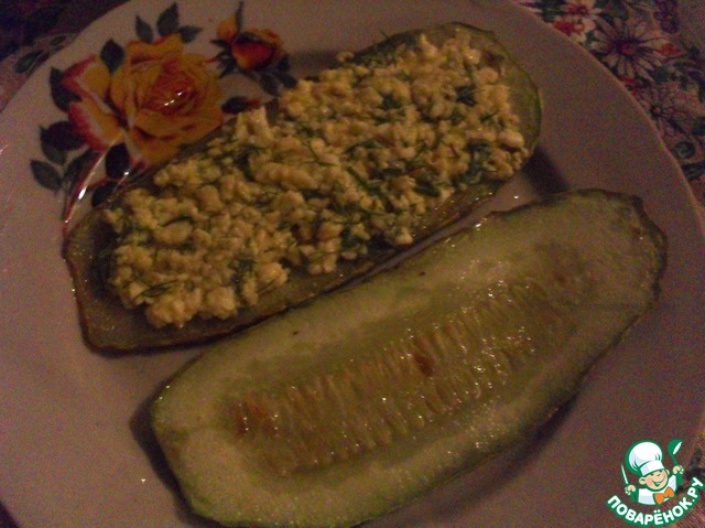 Укроп мелко порезать, добавить к творогу. Туда же добавить чеснок. Добавить по вкусу соль и перец. Учтите, что кабачки вообще не солили и не перчили.