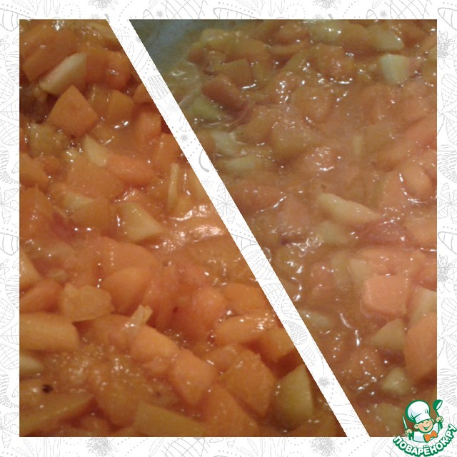 На первой части фото сок только начал выделяться, помешиваем дальше и ждем когда кусочки абрикоса полностью погрузятся в сок ( вторая часть ). -