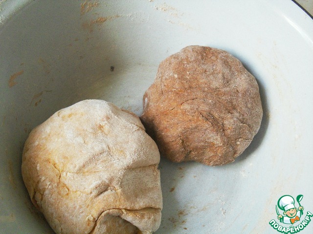 • В одну часть добавить 100г муки пшеничной. Во вторую -75 г муки и столовую ложку какао. У меня "глаз-алмаз" сломался и тесто поделено не одинаково...