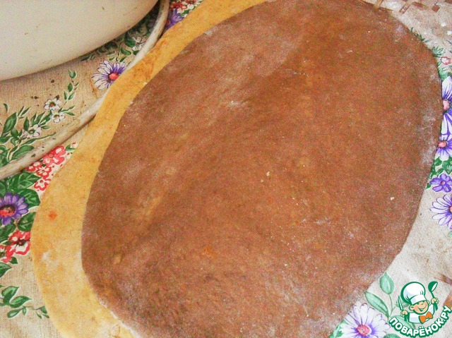 • Раскатываем каждый кусочек теста в прямоугольник. Выкладываем послойно друг на друга.
