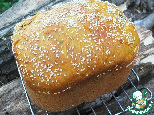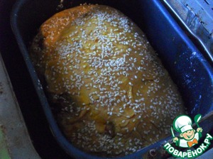 • Хлеб положить в форму (я пекла в х/п). Смазать верх желтком и посыпать кунжутом. Оставить на расстойку на 40 минут.