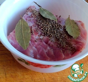 Положить в миску, добавить тмин, кориандр и лавровый лист. -