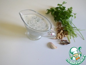 Для соуса смешайте нежирный йогурт или кефир с измельченными грецкими орехами, мелко порубленным укропом и выдавленным зубчиком чеснока.