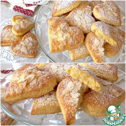 Вкусное, легкое в приготовлении печенье. Делала без миндаля и верх смазывала желтком, смешанным с водичкой плюс припудрила пудрой. Обязательно буду повторять!!!