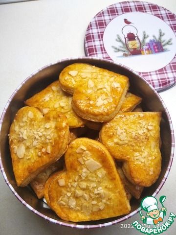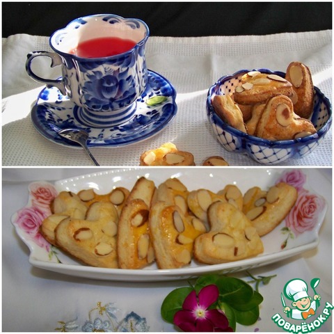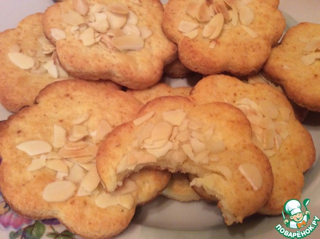 • Печенье смазать взбитым яйцом, посыпать миндальными лепестками, отправить в духовку для выпекания.