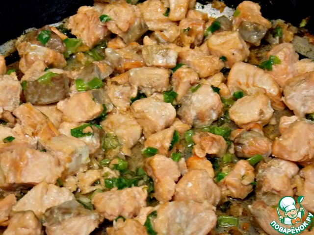 Филе порезать кубиком, лук нашинковать и обжарить все на масле до готовности. Дать остыть.