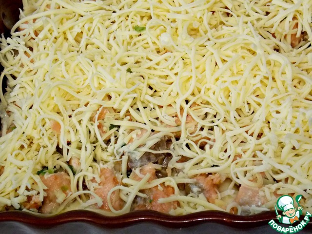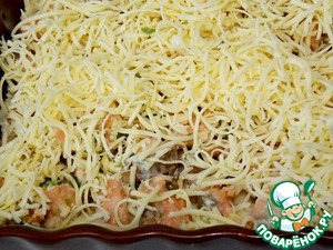 Форму 18 * 18 смазать маслом, выложить половину пшенной массы, разровнять, положить ровным слоем рыбу и засыпать все тертым сыром.