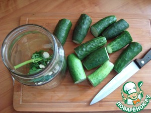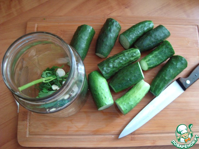 Моем огурцы. Я взяла крупноплодные огурцы и разрезала их пополам. Срезаем "попку". Если вы возьмёте огурцы маленькие, то нужно срезать с обеих сторон "попки". Для огурцов готовим банку 1 л. Выкладываем в неё укроп и порезанный чеснок.