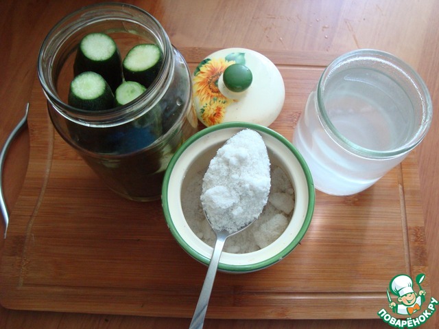 Укладываем огурцы, сколько поместится в банку. Берём банку 0,5 л и наливаем в неё кипяток, размешиваем в нём соль до полного растворения. Обратите внимание на ложку. Это самая настоящая столовая ложка (почему-то современные меньше размером). Соли берём столько, сколько я показала на этом фото.
