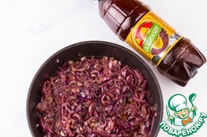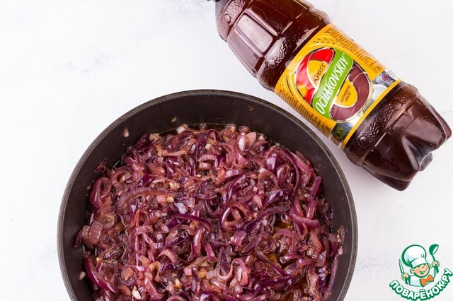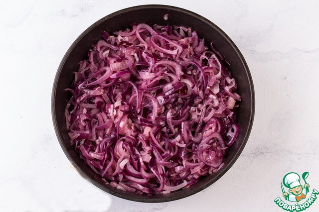 В оставшийся жир выложить порезанный полукольцами красный лук и обжаривать до прозрачности (около 10 минут).