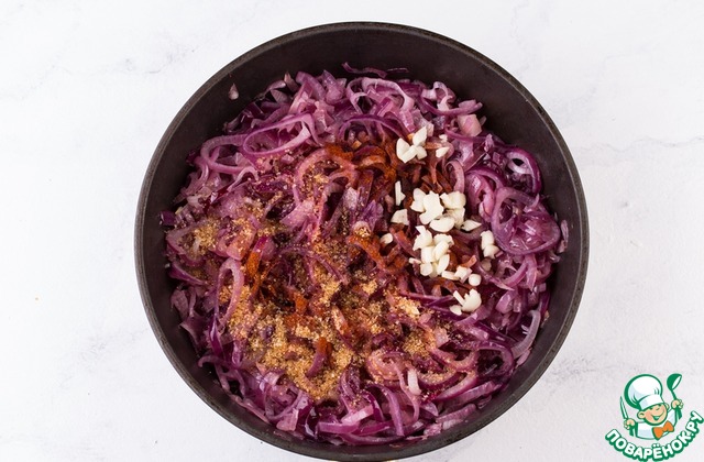 3. Добавить к луку мелко порезанный чеснок, коричневый сахар и паприку, хорошо перемешать.