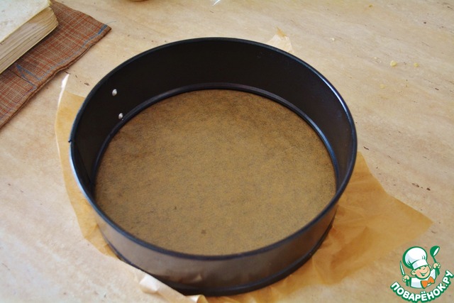 Тем временем подготовим разъемную форму (повторюсь, у меня диаметр 20 см) - застелить ее дно пекарской бумагой, как на фото.