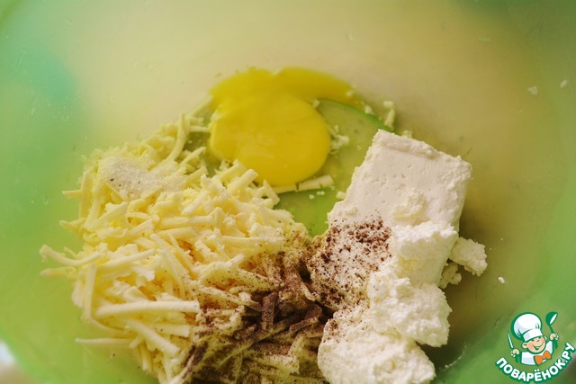 Натираем наш адыгейский сыр, соединяем его с желтком, творогом, присолим, поперчим и хорошенько перемешаем.