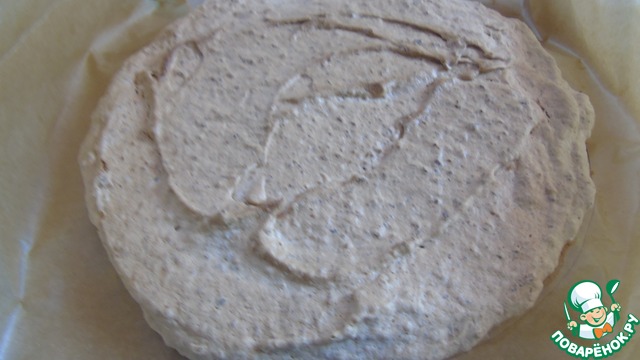 На пергаменте рисуем круги (18-20 см) 3 шт и выкладываем на каждый по 1/3 теста, из данного количества получится три коржа, можно сделать два, но больше в диаметре.