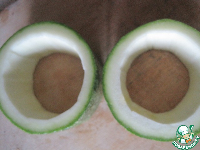 • Сворачиваем рулетом и вставляем в кружочек кабачка с начинкой.