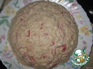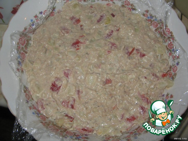Всё смешиваем, добавляем майонез, соль, перец - по вкусу. Мне масса сначала показалась очень жидкой и я испугалась, а как же формировать из неё мяч? Но мои опасения оказались напрасными, всё отлично сформировалось и не растеклось (к моему удивлению!).