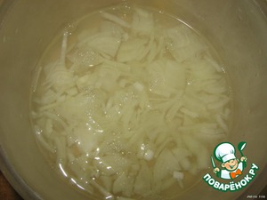 Лучок нарезаем соломкой и ошпариваем его кипятком, потом промываем холодной водой.