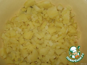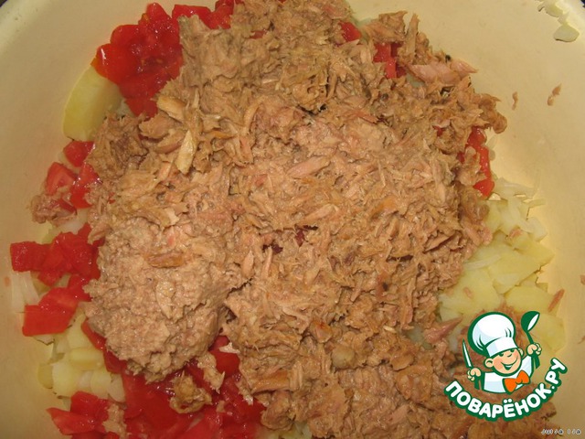 Добавляем тунец из баночки вместе с жидкостью (жидкости у меня в баночке оказалось совсем немного, но производители разные, поэтому нужно смотреть по содержимому).