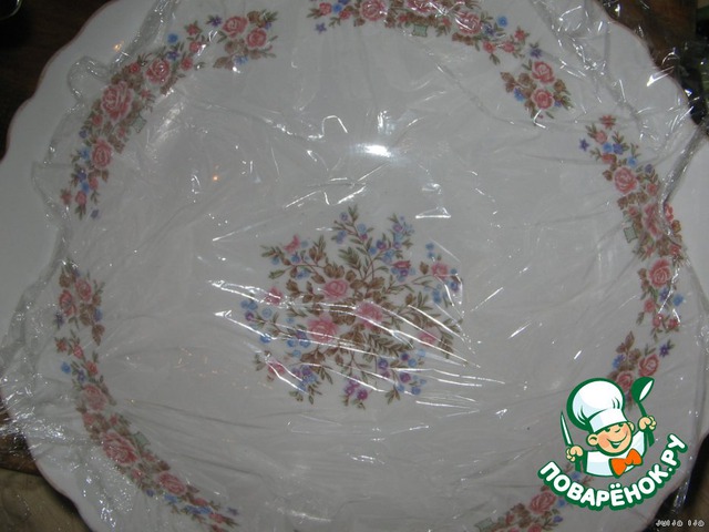 Любой салатник или форму с круглым дном устилаем пищевой плёнкой.