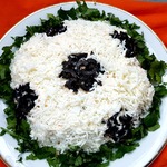 Маслины нарезаем соломкой вдоль и укладываем на наш мячик в форме пятиугольников. Вокруг делаем травку из мелко нарезанной зелени.
