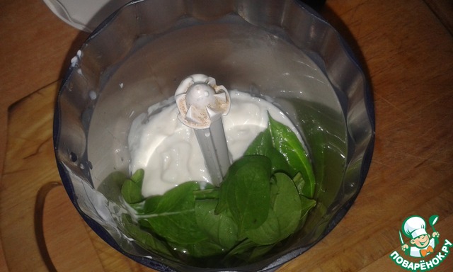 Для заливки в блендере смешать яйца, сметану, сыр, шпинат.