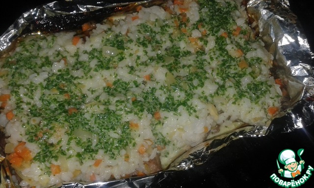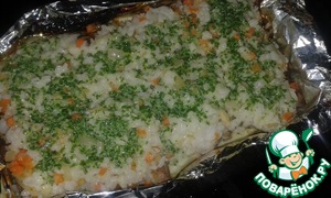 • Сверху положить рис, смешанный с морковью и луком и залить яично-срыной заливкой