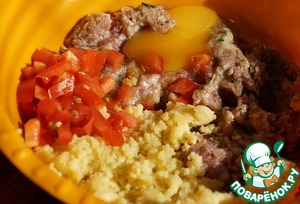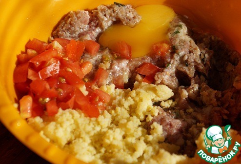 Смешиваем фарш ( у меня свино-говяжий), отварное пшено, нарезанный на кубики помидор, измельченный лук (если у вас его нет в составе фарша) и яйцо, приправляем солью, перцем.