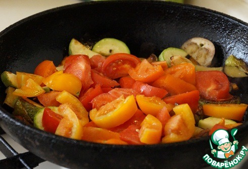 К обжаренным овощам добавляем нарезанные помидоры, тушим минут пять, вливаем пол стакана (примерно) воды.