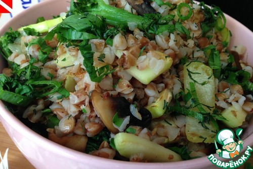 Огонь выключить, добавить остывшую гречку, заправить лимонным соком, по желанию посыпать мелко нарубленными грецкими орехами и зеленью.