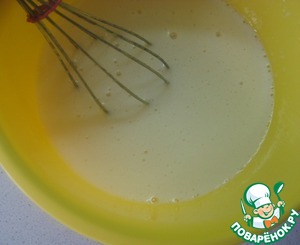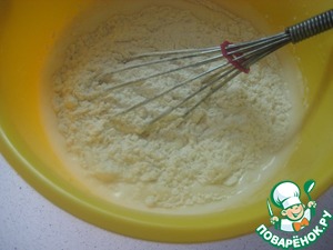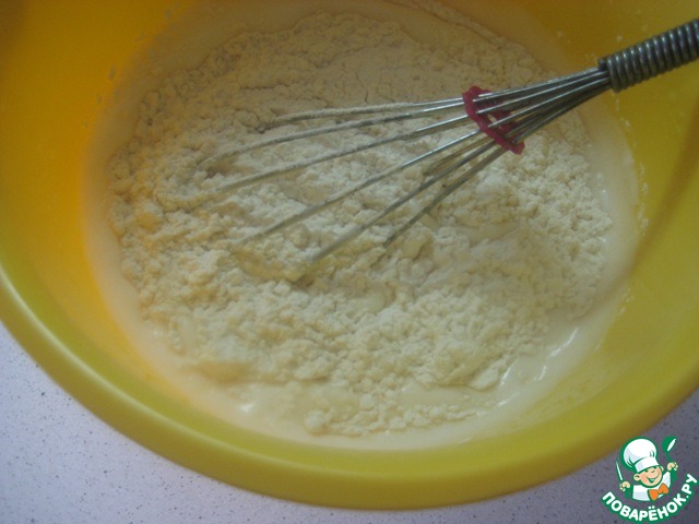Постепенно всыпая муку, хорошо перемешать до однородности (на этом этапе тесто по консистенции как жидкая сметана).