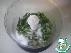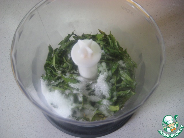 С веточек мяты оборвать листочки, положить в чашу блендера вместе с 1 ст. л. сахара и перебить в кашицу.
