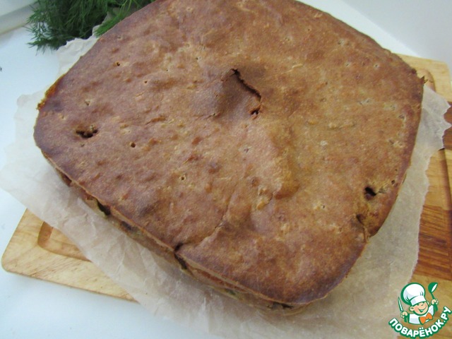 Пока пирог теплый его можно подать с соусом из майонеза, тертых соленых огурчиков и мелко нарезанного укропа.