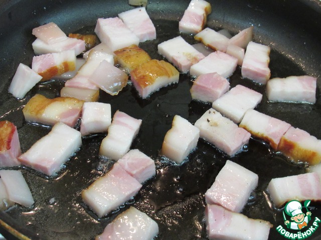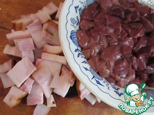 Нарезаем мелким кубиком печень и копченую грудинку.