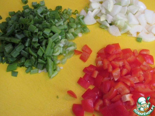 Мелко нарезаем все части (белую и зеленую) луковиц и сладкий перец. Сначала я хотела использовать зеленый перец - он имеет более яркий вкус, но в последний момент порезала красную перчину - так будет красивее!
