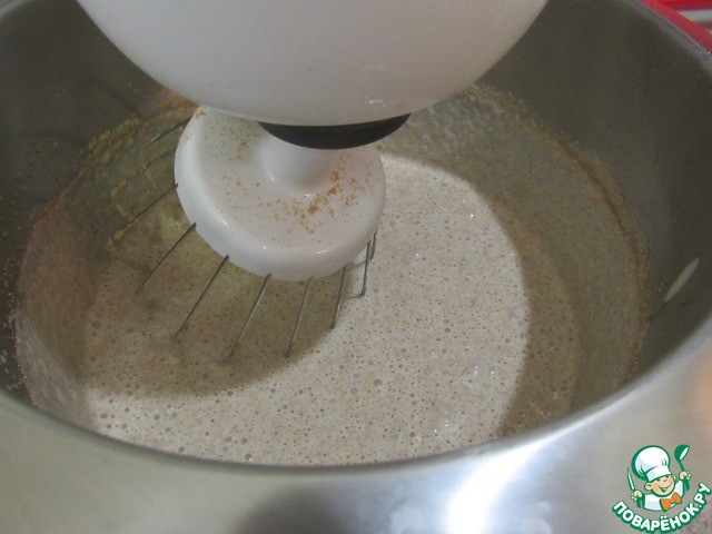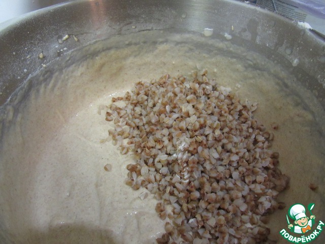 Добавляем сухие ингредиенты: сначала гречневую муку и перемешиваем несколько минут, чтобы мука набухла.