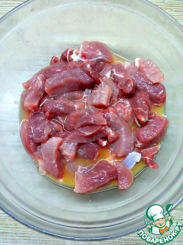 Мясо нарезать небольшими кусочками и добавить сок апельсина. Убрать в холодильник на час.