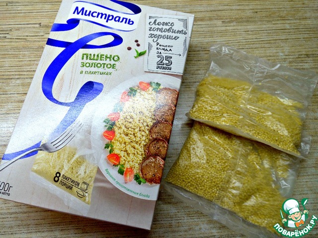 Пшено использую в пакетиках от ТМ "Мистраль". Кидаем в кипящую подсоленную воду и варим до готовности в течение времени, указанного на упаковке.