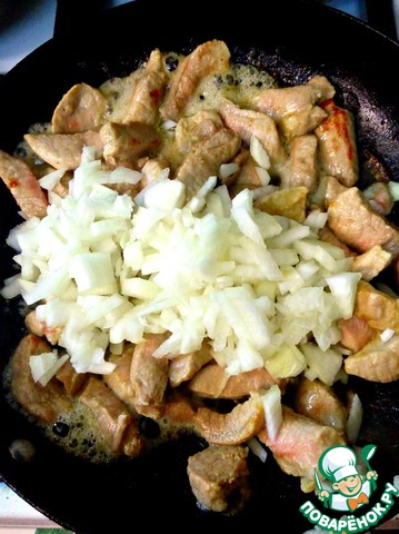Мясо отжимаем (маринад не выливаем), обжариваем на разогретом растительном масле, постоянно помешивая, чтобы не образовалась корочка, почти до готовности. Лук очистить, порезать мелким кубиком и добавить к мясу. Немного обжарить лук вместе с мясом.