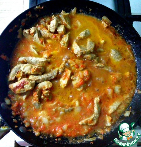 Залить мясо томатом, добавить оставшийся маринад, посолить, добавить красный жгучий перец и тушить на слабом огне 25 минут.