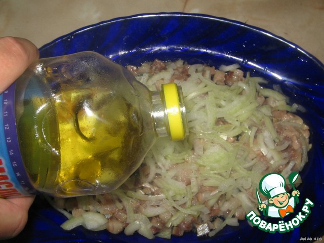 Укладываем в селёдочницу или на блюдо сельдь, на неё лук (его нужно хорошо отжать). Поливаем слегка растительным маслом (я люблю с запахом).