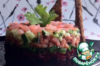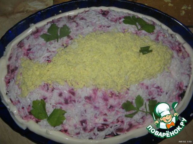 Из яиц я решила сделать украшения. Белки просто натёрла на тёрке и уложила на салат. Майонезом не смазывала. Белков оказалось маловато, но под ними красиво просвечивалась свекла. Из желтков я сделала рыбку. Просто вырезала на пергаментной бумаге рыбку, положила её (бумагу) на салат (рыбку вырезала по контуру, грубо говоря рыбка это дырка :-*). Свободное от бумаги пространство засыпала натёртым на мелкой тёрке желтком. Украсила зеленью (водоросли). Салатику лучше немного постоять пропитаться. Приятного аппетита!